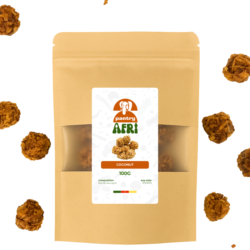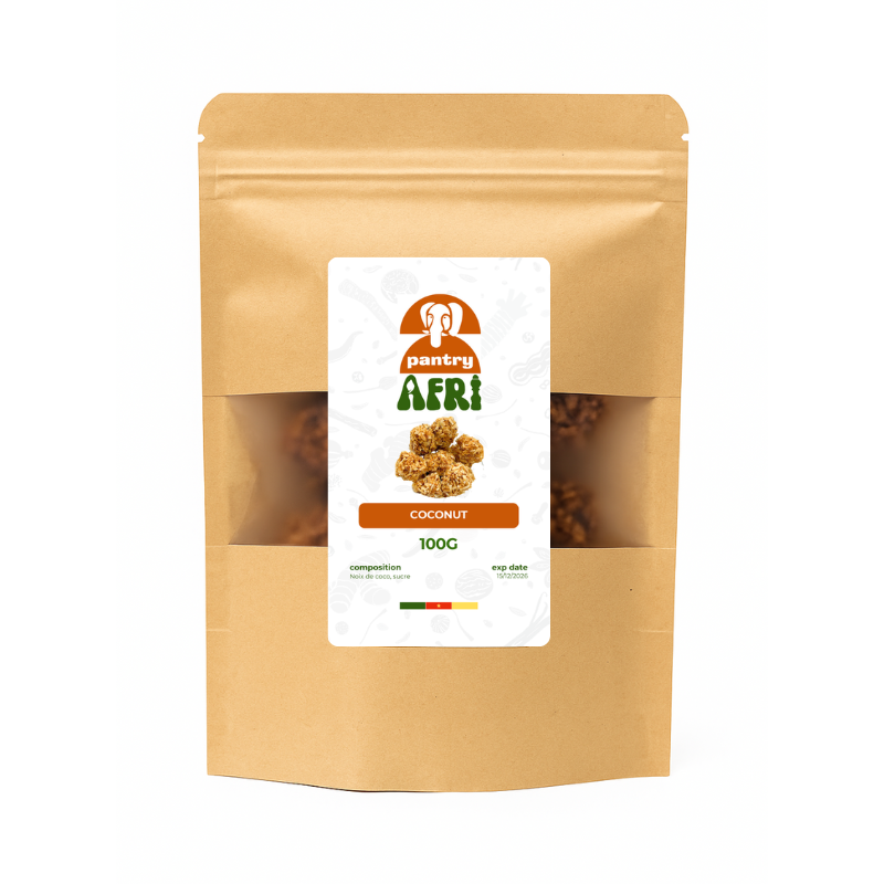 Les boules de noix de coco caramélisée d’AfriPantry sont une véritable madeleine de Proust pour ceux qui ont grandi en Afrique de l’Ouest ou dans les Caraïbes. Elles sont préparées à partir de noix de coco râpée, lentement cuite avec du sucre jusqu’à obtention d’un caramel doré, puis roulées à la main en petites boules croquantes et savoureuses.